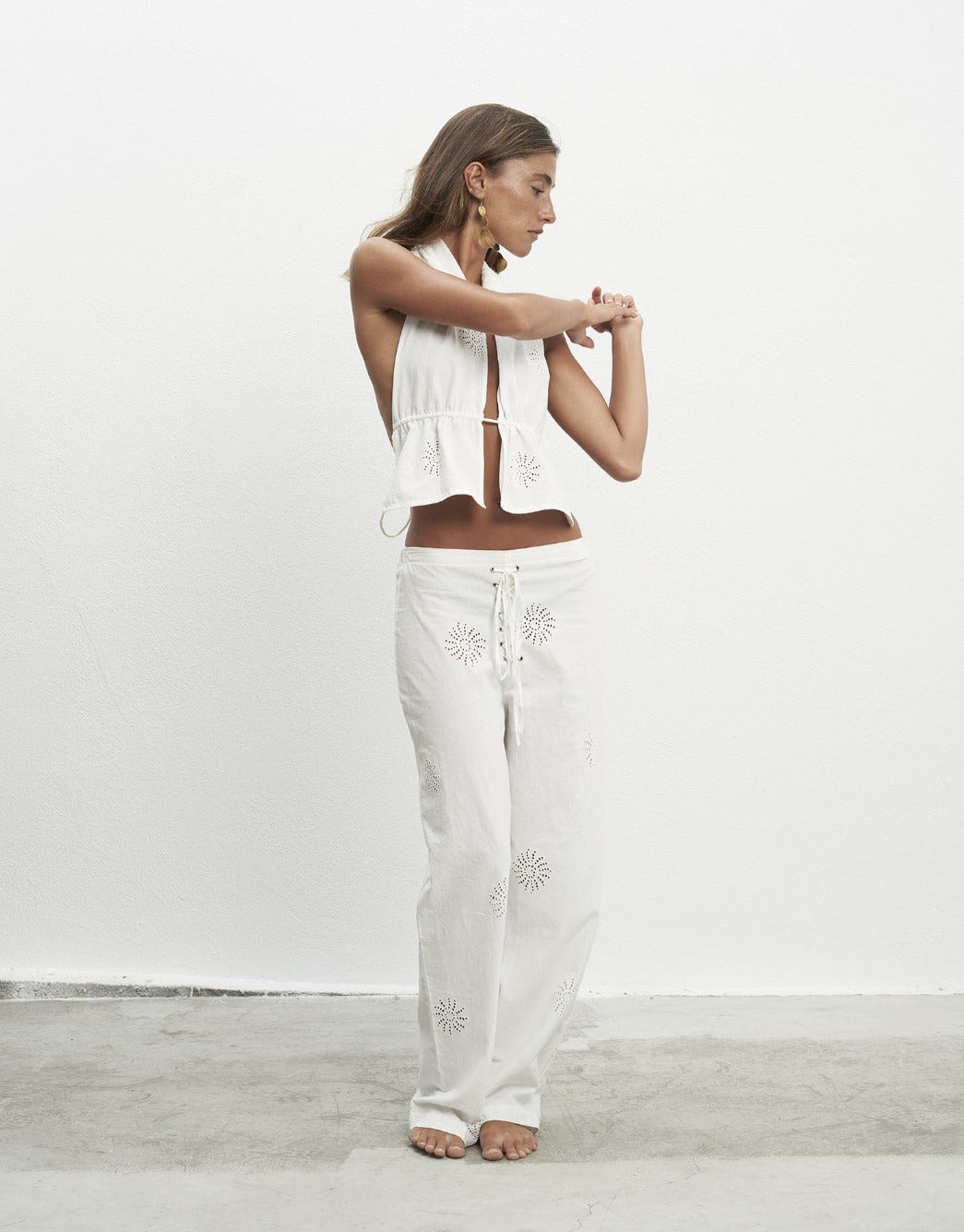 White 100% cotton top, with 2 wide straps on the front, and open back. Sun-shaped draft. Ideal to combine with matching pants, jeans or sarong.